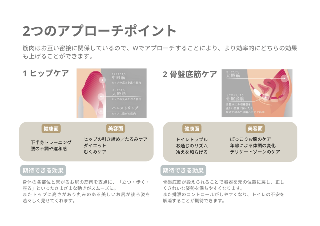 出産、加齢、肥満、運動不足等による衰えにより、骨盤底筋が緩んでしまうことがあります。骨盤底筋が緩むことで、尿漏れや便秘、膣の緩み、性的満足低下、骨盤臓器脱などの症状につながります。